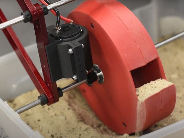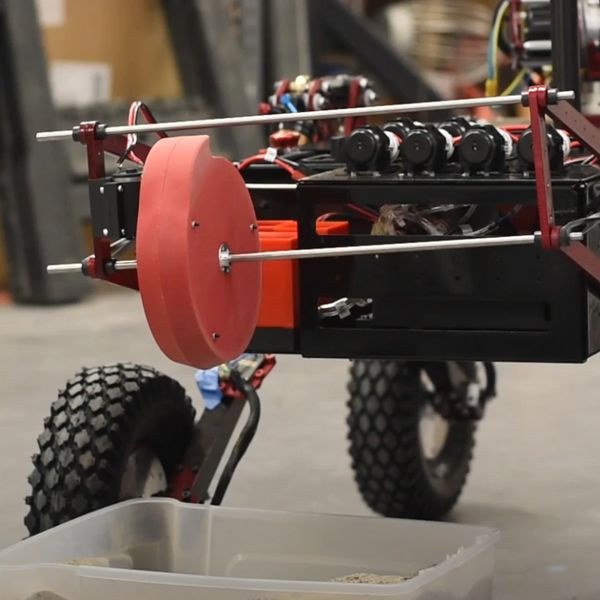 Designed a soil collection subsystem responsible for gathering and delivering samples to the rover’s onboard life-detection system. The mechanism features a circular shovel optimized to distribute moment loads during excavation, mounted on a four-bar linkage that raises and lowers the shovel between the ground and the mixing chambers. The shovel is driven by a brushed DC motor coupled through bevel gears, rigidly mounted to the four-bar assembly.