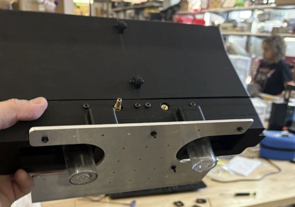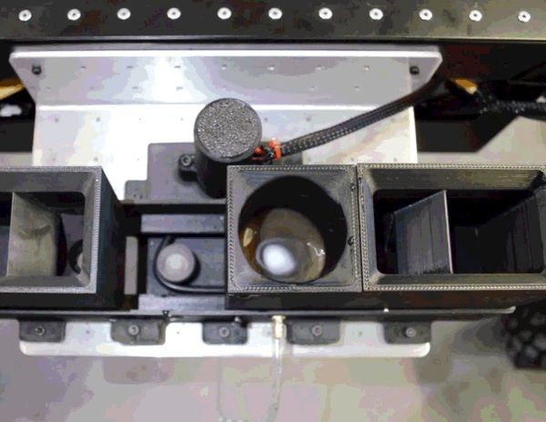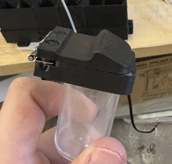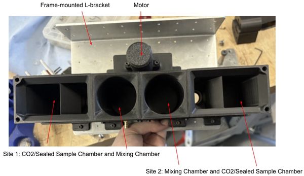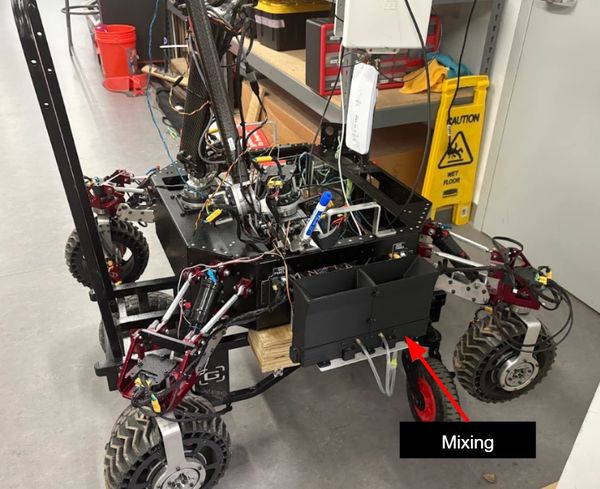 Designed a mixing chamber system that combines soil samples with DMSO for spectroscopy and acetic acid for CO₂ and humidity sensing. A divided funnel evenly distributes collected soil between the mixing and CO₂ chambers for each site of interest. Each CO₂ chamber integrates a magnetically attached sealed-sample cache that can be removed from the system to present to the judges. The cache, secured with neodymium magnets and a spring-loaded hinge, remains open during sampling and automatically seals when detached. Mixing is performed by stir bars driven through a pulley and belt system powered by a 12V DC motor, with the assembly mounted on an aluminum L-plate fixed to the rover chassis.